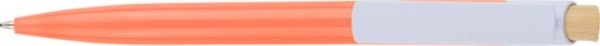 Guľôčkové pero z recyklovaného ABS plastu s bambusovým tlačidlom a bielym klipom, vhodné na digitálnu tlač. Približná dĺžka písania 600 metrov. Modrá náplň.