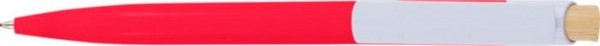 Guľôčkové pero z recyklovaného ABS plastu s bambusovým tlačidlom a bielym klipom, vhodné na digitálnu tlač. Približná dĺžka písania 600 metrov. Modrá náplň.