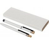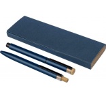 Sada lakovaných pier z recyklovaného hliníka. Bambusové tlačidlo, lem z recyklovaného PET materiálu; roller má bambusový/rPET vrchnák. Píše 700m (guľôčkové pero) a 500m (roller). Modrá náplň. Balené vo farebnej darčekovej krabičke z recyklovaného kartónu.