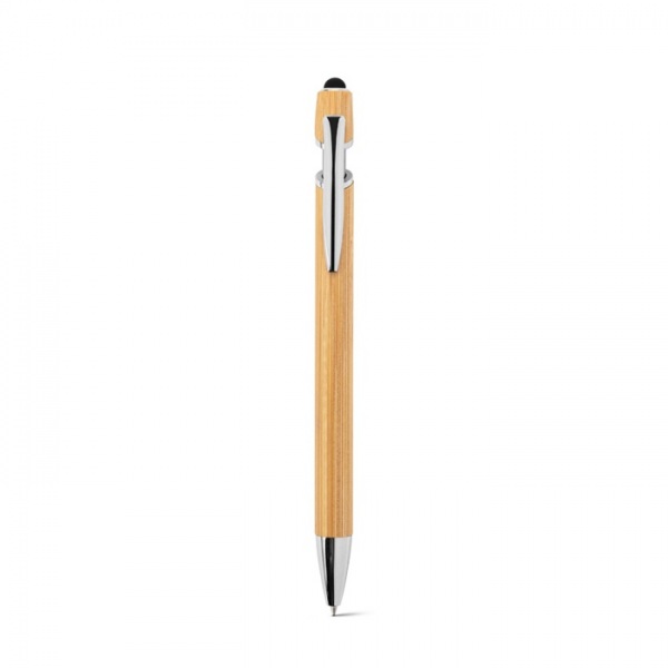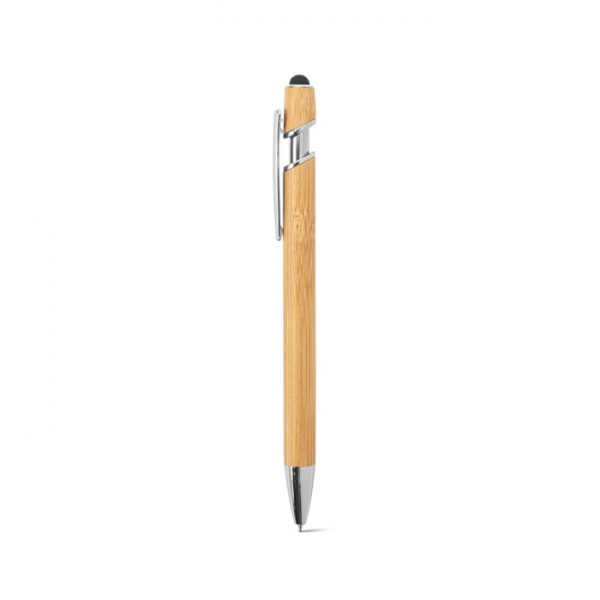 Bambusové guľôčkové pero s chrómovanými hliníkovými detailmi. Má klip a dotykovú špičku na vrchole. Modrá náplň.