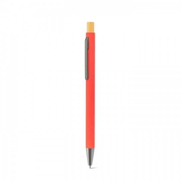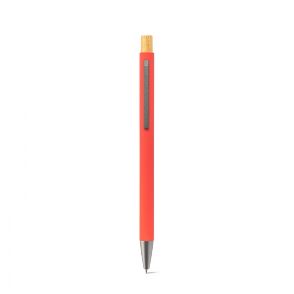 Guľôčkové pero z recyklovaného hliníka (100) s gumovým povrchom. Jeho minimalistický dizajn kombinuje matné kovovo šedé detaily a bambusové tlačidlo na vrchole. Modrá náplň. Pri laserovom gravírovaní je logo strieborné.