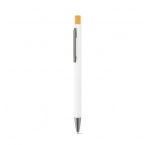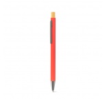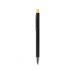 Guľôčkové pero z recyklovaného hliníka (100) s gumovým povrchom. Jeho minimalistický dizajn kombinuje matné kovovo šedé detaily a bambusové tlačidlo na vrchole. Modrá náplň. Pri laserovom gravírovaní je logo strieborné.