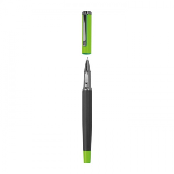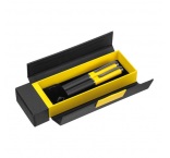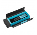 Kovová písacia súprava s modrou náplňou, pozostávajúca z guľôčkového pera (dĺžka písania 800 m) a roller pera (dĺžka písania 500 m) v farebne zladenom sklápacom puzdre
