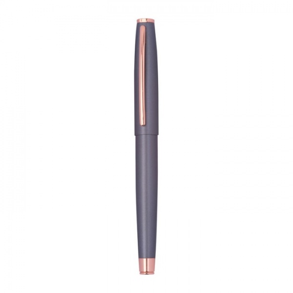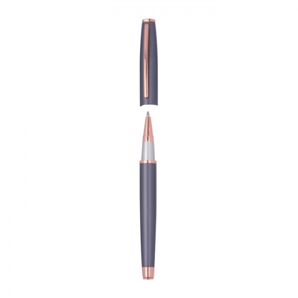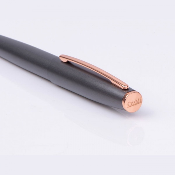 Kovová písacia sada CrisMa, pozostávajúca z guľôčkového pera twist (dĺžka písania 800 m) a roller pera (dĺžka písania 500 m) z kovu s detailmi vo farbe rosegold. Oba perá majú modrú náplň a sú balené v čiernej kartónovej krabičke