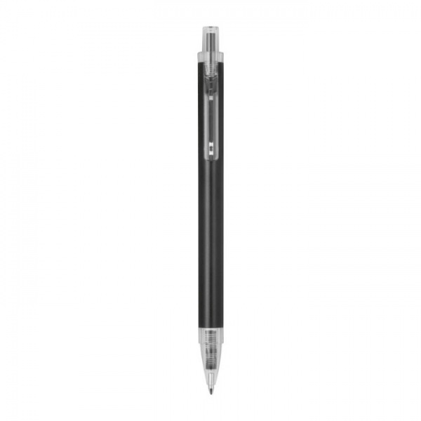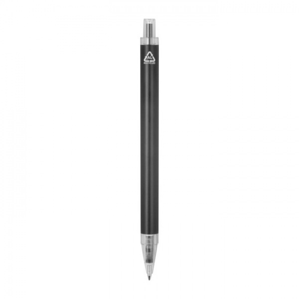 Guľôčkové pero vyrobené z recyklovaného hliníka a plastu (RPET) s priehľadným klipom a modrou atramentovou náplňou.