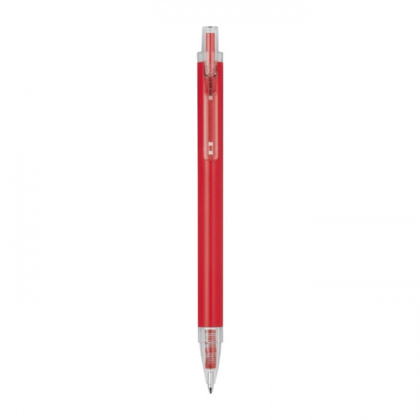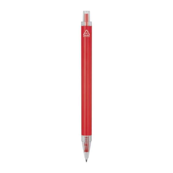 Guľôčkové pero vyrobené z recyklovaného hliníka a plastu (RPET) s priehľadným klipom a modrou atramentovou náplňou.