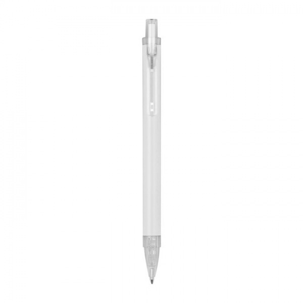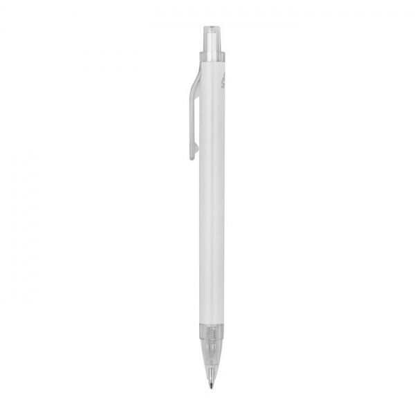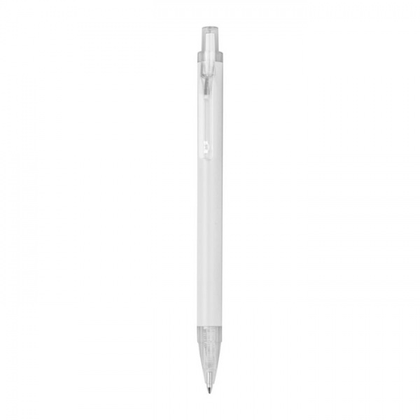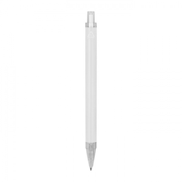 Guľôčkové pero vyrobené z recyklovaného hliníka a plastu (RPET) s priehľadným klipom a modrou atramentovou náplňou.