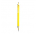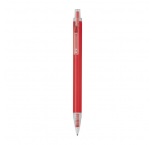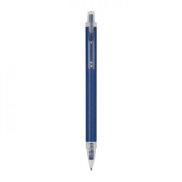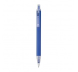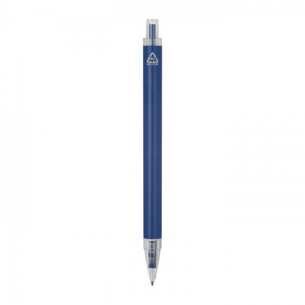 Guľôčkové pero vyrobené z recyklovaného hliníka a plastu (RPET) s priehľadným klipom a modrou atramentovou náplňou.