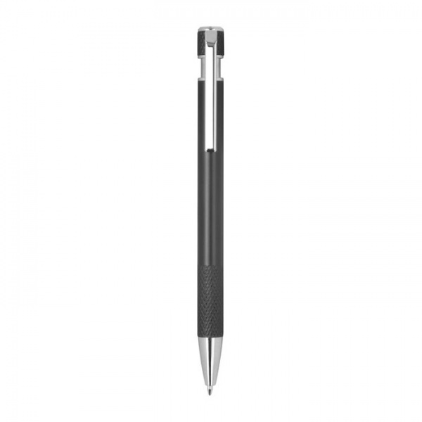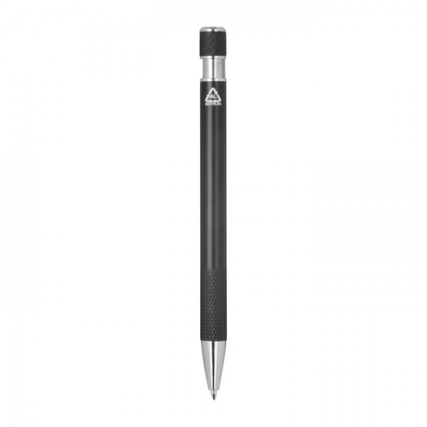 Guľôčkové pero vyrobené z recyklovaného hliníka so vzorovaným úchopom, tlačidlovým mechanizmom a modrou náplňou.