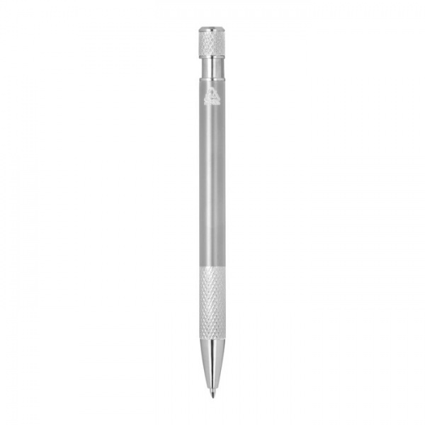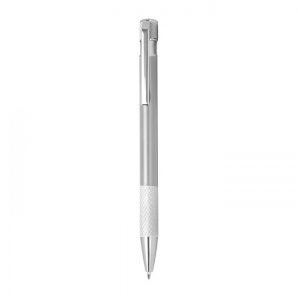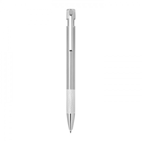 Guľôčkové pero vyrobené z recyklovaného hliníka so vzorovaným úchopom, tlačidlovým mechanizmom a modrou náplňou.