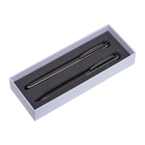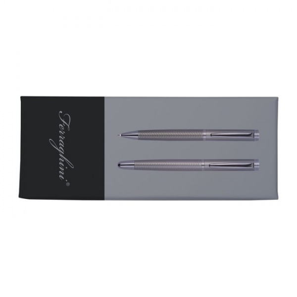 Písacia sada Ferraghini pozostávajúca z otočného guľôčkového pera s modrou náplňou (dĺžka písania 600 m) a plniaceho pera z nehrdzavejúcej ocele (vrátane modrej náplne).