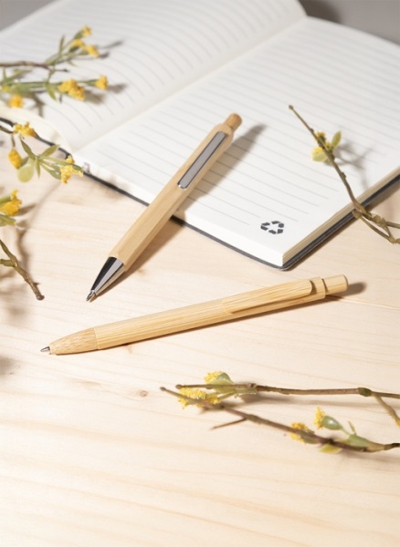 Guľôčkové pero s bambusovým telom, klipom, tlačidlom a hrotom. S modrou náplňou.