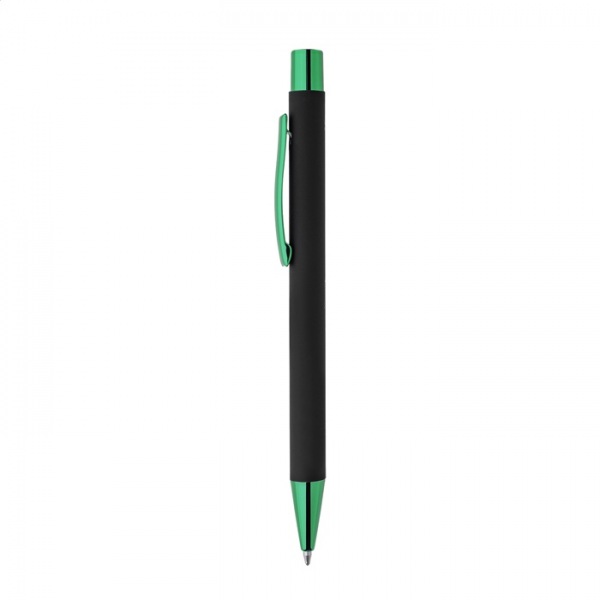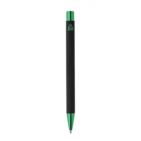 Guľôčkové pero z recyklovaného hliníka s čiernym pogumovaným telom a farebnými lesklými kovovými časťami. So špeciálnym povrchom na zrkadlové gravírovanie, ktoré ladí s kovovými časťami. S modrou náplňou.