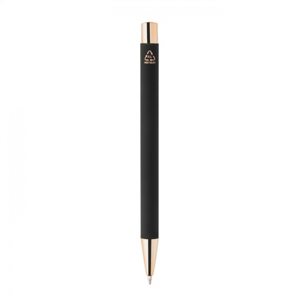 Guľôčkové pero z recyklovaného hliníka s čiernym pogumovaným telom a farebnými lesklými kovovými časťami. So špeciálnym povrchom na zrkadlové gravírovanie, ktoré ladí s kovovými časťami. S modrou náplňou.