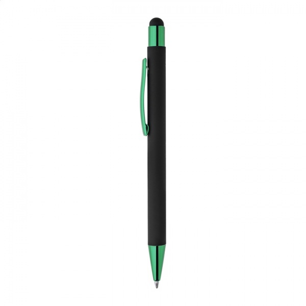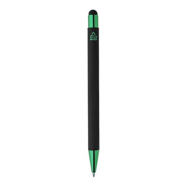 Guľôčkové pero z recyklovaného hliníka na dotykovú obrazovku, s čiernym pogumovaným telom a farebnými lesklými kovovými časťami. So špeciálnym povrchom na zrkadlové gravírovanie, ktoré ladí s kovovými časťami. S modrou náplňou.