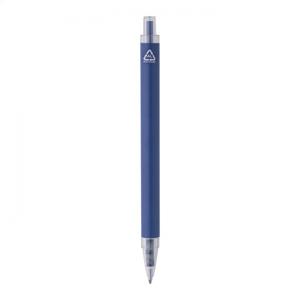 Guľôčkové pero z recyklovaného hliníka s matným telom a priehľadnými RPET časťami. S modrou náplňou.