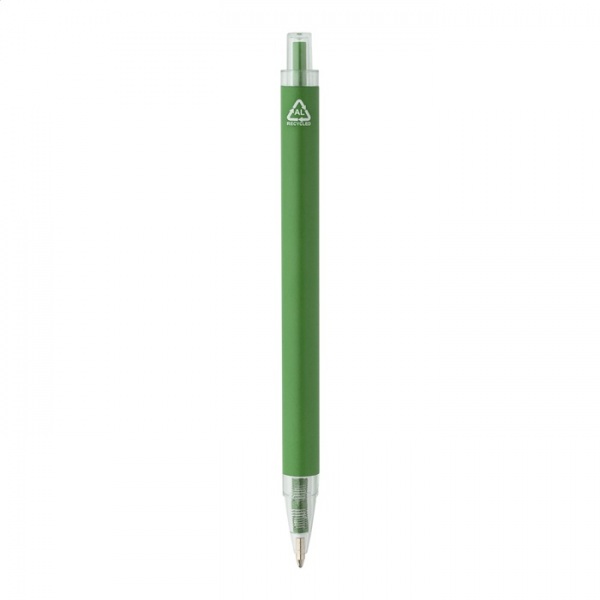 Guľôčkové pero z recyklovaného hliníka s matným telom a priehľadnými RPET časťami. S modrou náplňou.