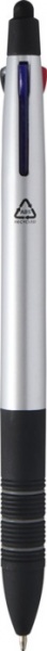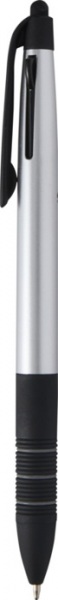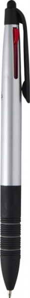 Guľôčkové pero 3v1 z ABS plastu s certifikáciou RCS s moderným kovovým povrchom a integrovaným stylusom. Je vybavené mechanizmom na ľahké prepínanie medzi čiernym, modrým a červeným atramentom. Ergonomická rukoväť s čiernou protišmykovou gumou.