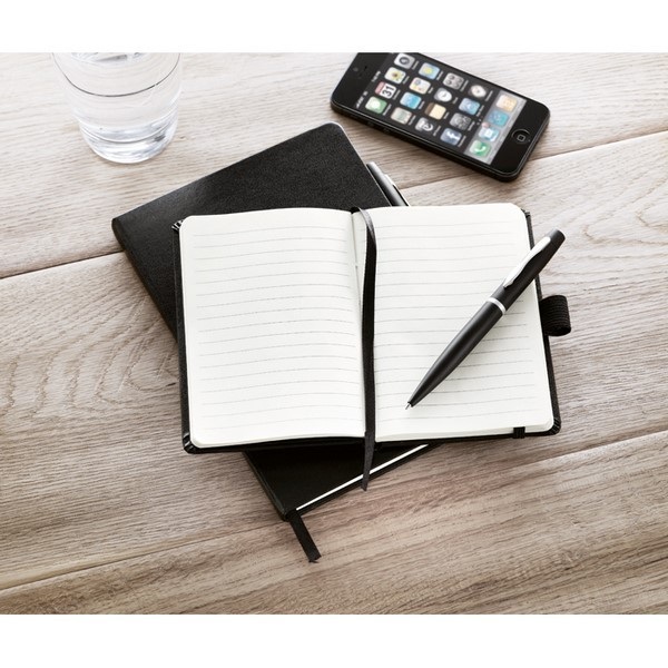 Obsahuje kovové guličkové pero s modrým atramentom.