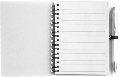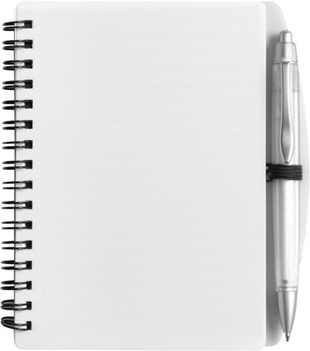 Zápisník A6 s krúžkovou väzbou, 65 stránkami a plastovým guľôčkovým perom s modrým atramentom.