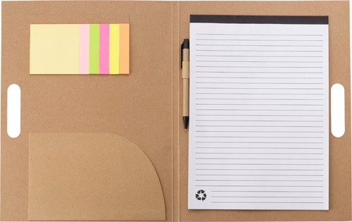Portfólio A4 z kartónu s poznámkovým blokom (25 linajkových strán), guľôčkovým perom (modrá náplň) a so samolepiacimi lístočkami rôznych farieb.