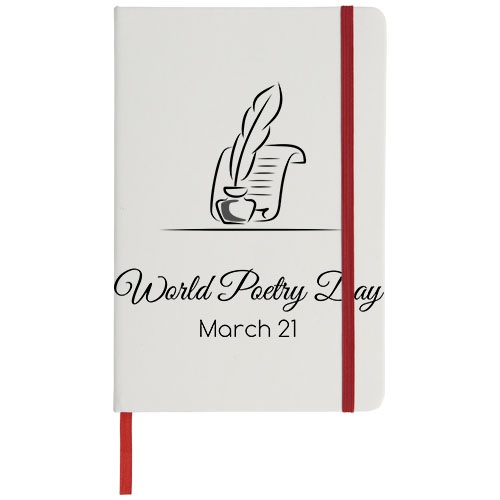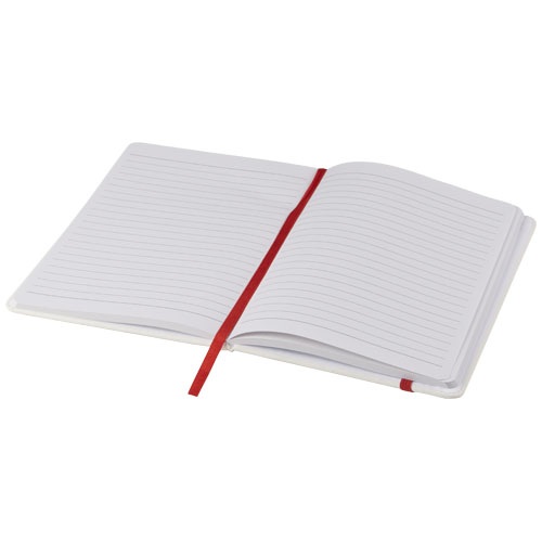 Biely zápisník A5 s farebnou páskou, s farebným elastickým zatváraním a stužkou.