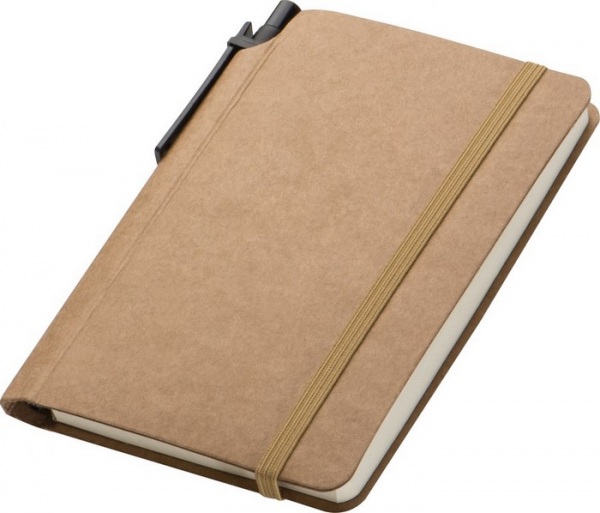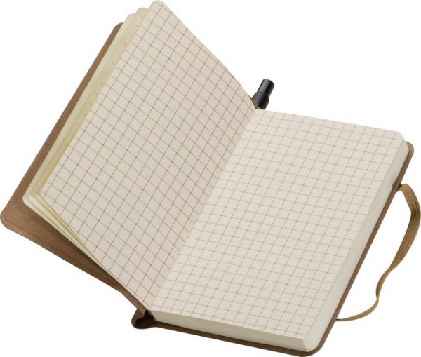 Zápisník s obalom, ktorý je šetrný k životnému prostrediu, 80 kockovanými stranami a gumičkou. Zápisník je dodaný spolu s perom.
