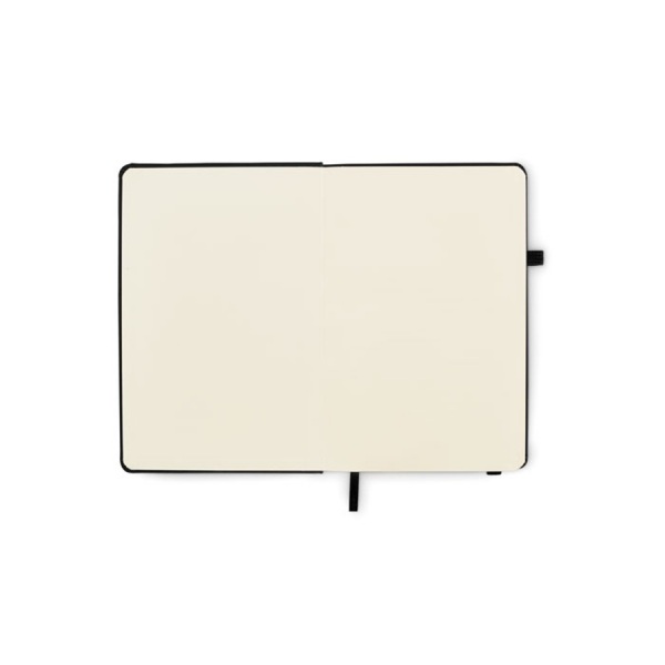Zápisník formátu A5 s obálkou zo 70% recyklovanej predprodukčnej kože a 30% latexového PU. Recyklovaný papier, 192 linkovaných strán (96 listov). Elastická gumička a držiak na pero.
