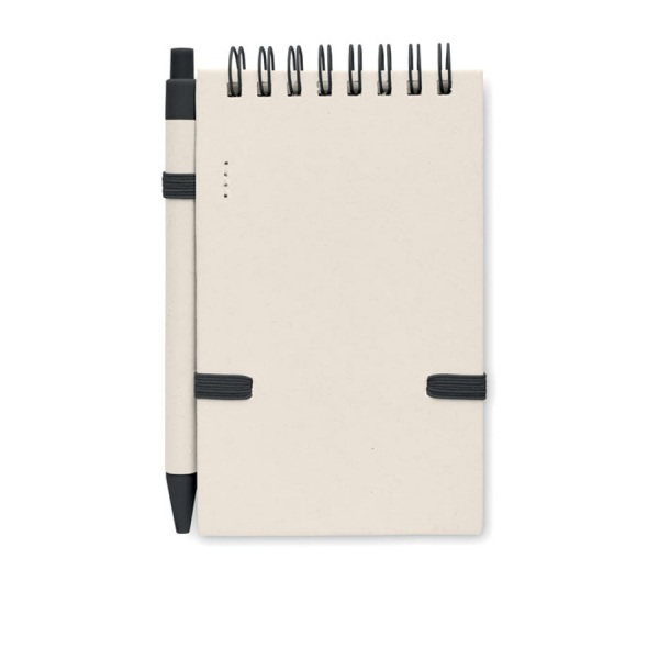 Kroužkový zápisník A6 (70 listů) z recyklovaných krabic od mléka (70 % recyklované krabice od mléka a 30 % recyklovaný papíru) s odpovídající propiskou. Modrý inkoust. Elastická gumička a poutko na propisku.