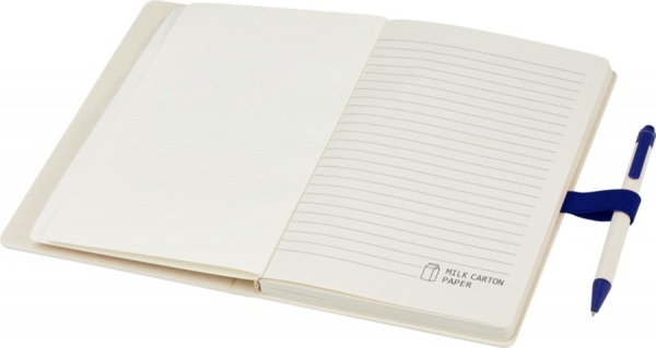 Pero s čiernou náplňou. 80 linajkových listov (80 g/m2) z recyklovaných kartónov od mlieka (až zo 70%). Pero má telo z rovnakého materiálu, klip, hrot a stláčací mechanizmus z farebného plastu PLA.