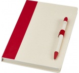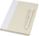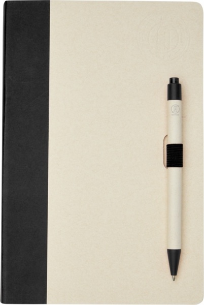 Pero s čiernou náplňou. 80 linajkových listov (80 g/m2) z recyklovaných kartónov od mlieka (až zo 70%). Pero má telo z rovnakého materiálu, klip, hrot a stláčací mechanizmus z farebného plastu PLA.