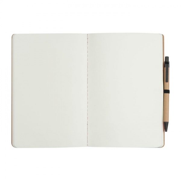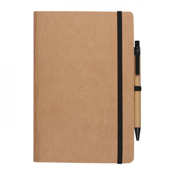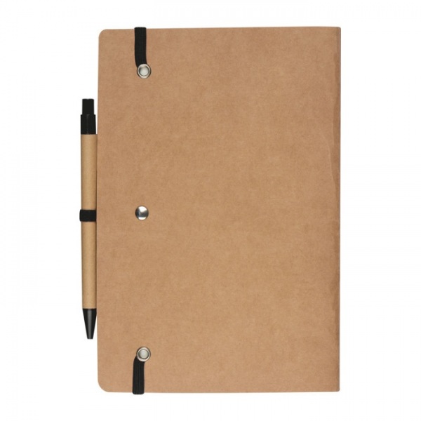 Zápisník A5 z recyklovaného papiera so 120 stranami, gumičkou na zapínanie a pútkom na pero vrátane pera s modrou náplňou.