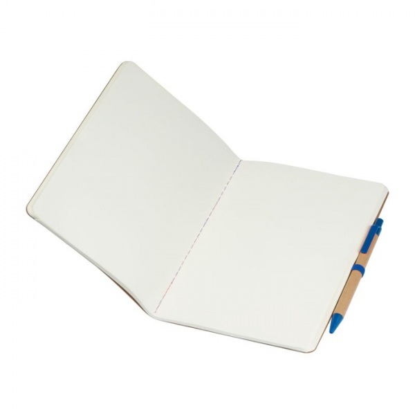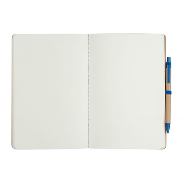 Zápisník A5 z recyklovaného papiera so 120 stranami, gumičkou na zapínanie a pútkom na pero vrátane pera s modrou náplňou.