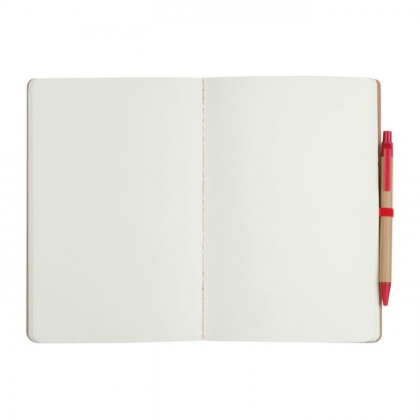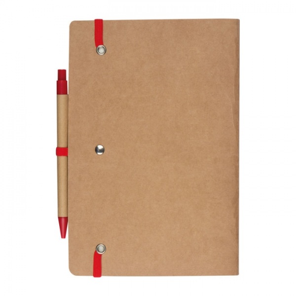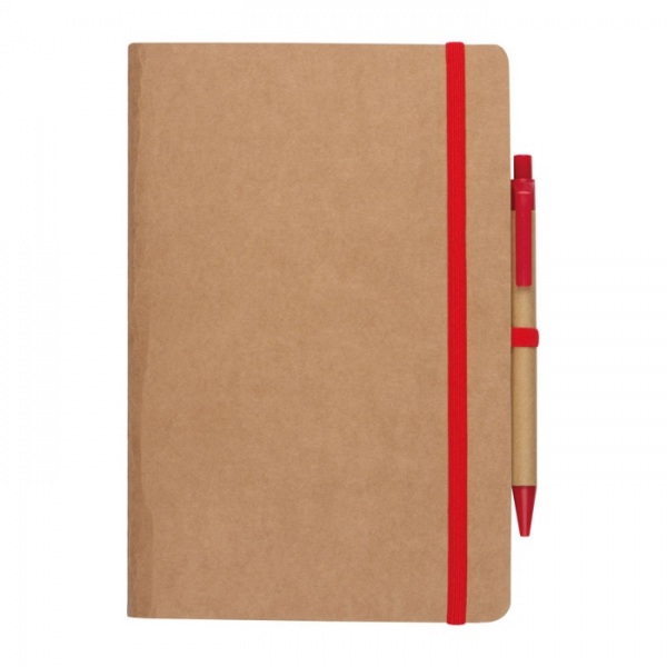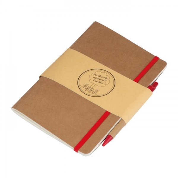 Zápisník A5 z recyklovaného papiera so 120 stranami, gumičkou na zapínanie a pútkom na pero vrátane pera s modrou náplňou.