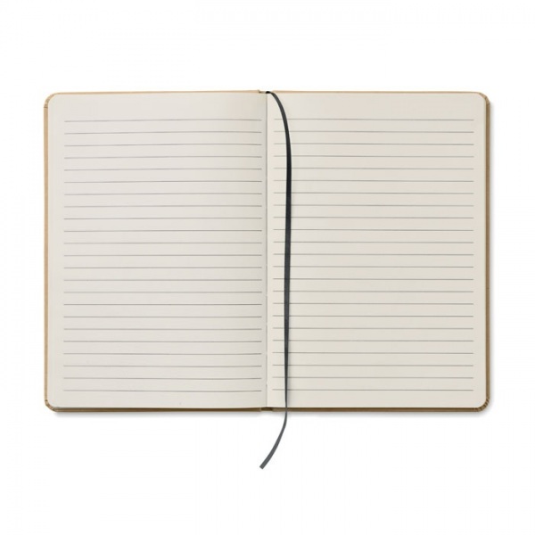 Zápisník A5 s obalom z tvrdého recyklovaného kartónu. 160 linajkových strán (80 listov recyklovaného papiera). Elastický remienok a pútko na pero, záložka so stuhou. Guľôčkové pero s telom z recyklovaného papiera. Modrá náplň.