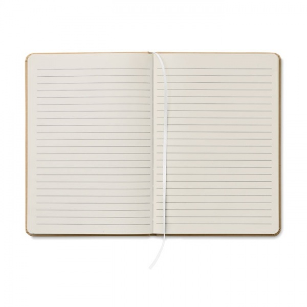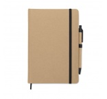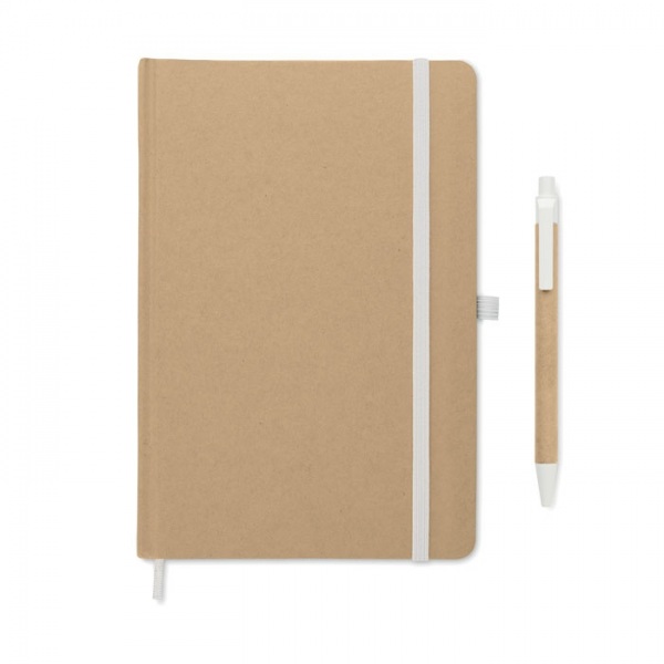 Zápisník A5 s obalom z tvrdého recyklovaného kartónu. 160 linajkových strán (80 listov recyklovaného papiera). Elastický remienok a pútko na pero, záložka so stuhou. Guľôčkové pero s telom z recyklovaného papiera. Modrá náplň.