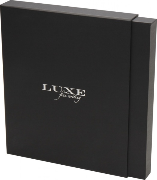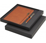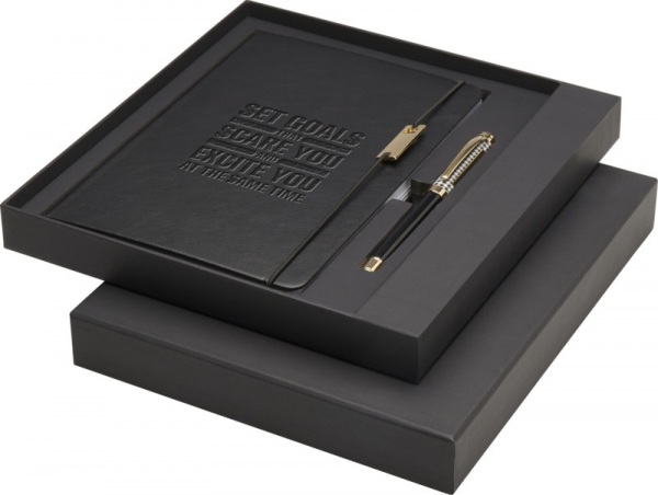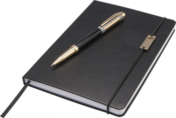 Pero s čiernou náplňou, dĺžka písania: 400 metrov, hrot: 0,7 mm. Zápisník má 80 listov linkovaného papiera 80 g/m?, dosky z recyklovaného plastu, elastické zatváranie, stuhu ako záložku a vrecko. Dodáva sa v darčekovej krabičke z recyklovanej lepenky.