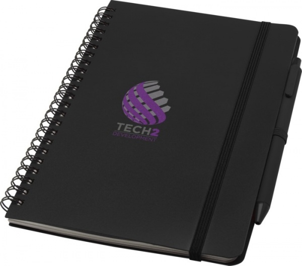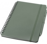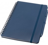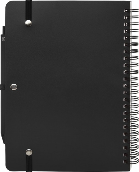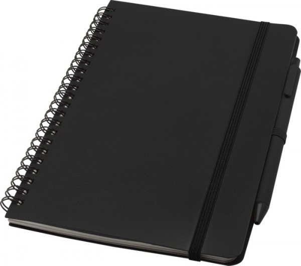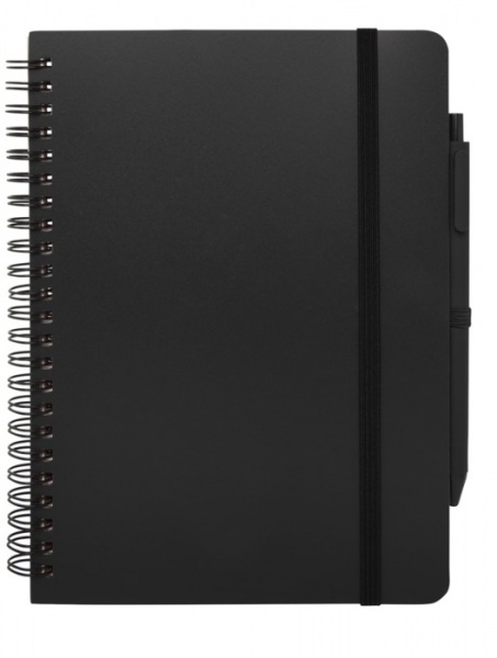 Zápisník A5 s pevnou obálkou z recyklovaného plastu, ktorý by inak skončil v oceáne, s 80 linajkovými listami papiera 70 g/m2 v krémovej farbe. Zaoblené rohy, elastické zatváranie a pútko na pero. Pero s čiernou náplňou. Dĺžka písania: 1000 m. Hrot: 1,0 mm.