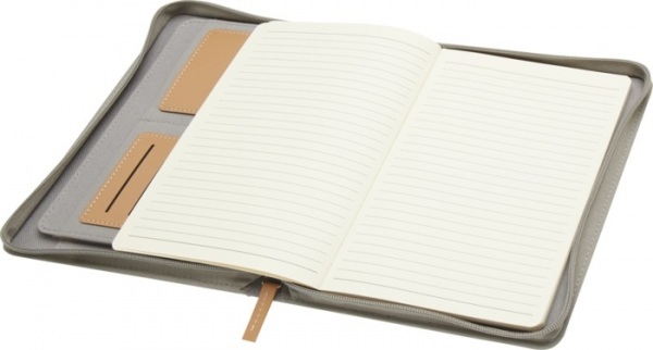 Portfólio A5 so zaoblenými rohmi je praktickou pomôckou do každej kancelárie a je vyrobené z recyklovaného plastu. Disponuje 64 linajkovými listami papiera v krémovej farbe s gramážou 80 g/m2, zapínaním na zips, pútkom na pero a rozšíriteľným vreckom.