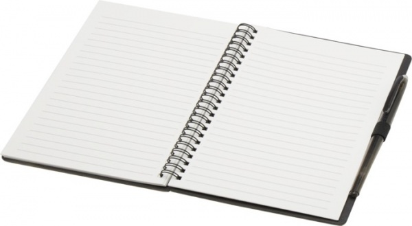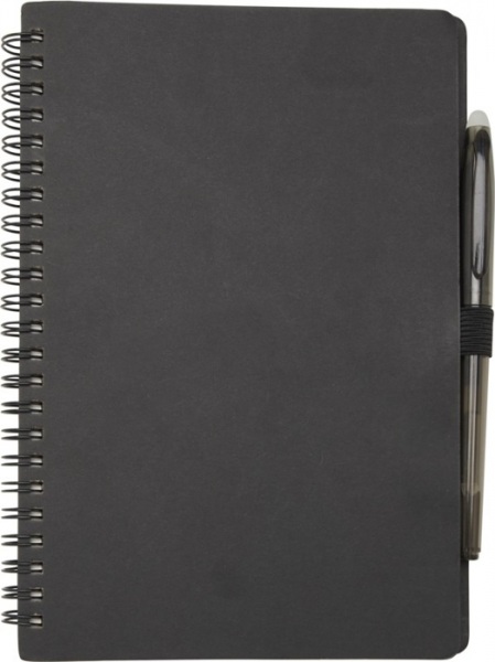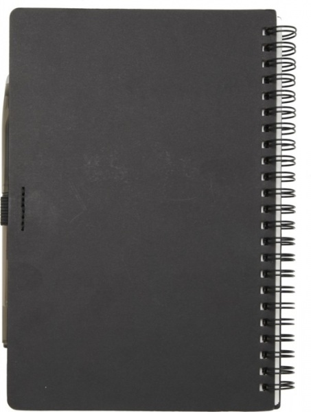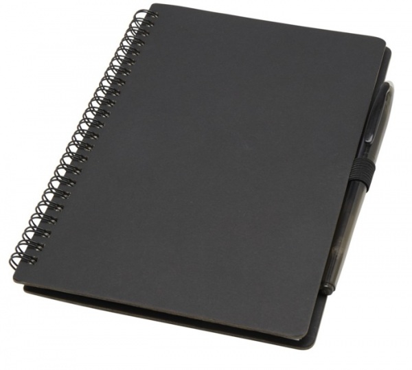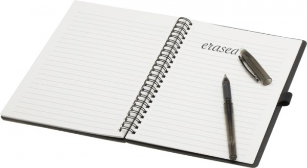 Sada pera a zápisníka z kamenného papiera na opakované použitie. Obálka z lepenky, zaoblené rohy a 32 listov linkovaného papiera 120 g/m2. Na zadnej strane vrecko s čiernou handričkou. Mazacie pero z recyklovaného plastu s bielou gumou a čiernou náplňou.