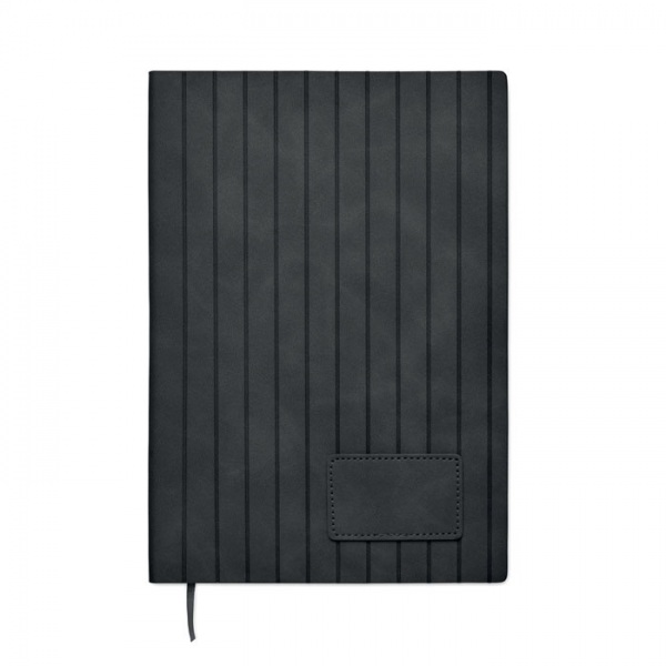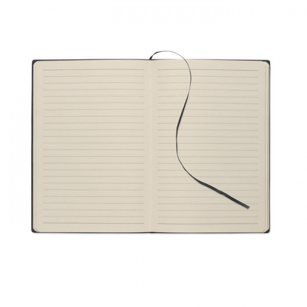 Zápisník A5 s mäkkým dymovým rebrovaným obalom z PU zo 40 % recyklovaného materiálu a 60 % PU s jednofarebnou PU záplatou. 160 linajkových strán, 70 g/m2 recyklovaný papier (80 listov). Farebne zladená polyesterová stuha.