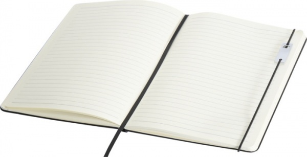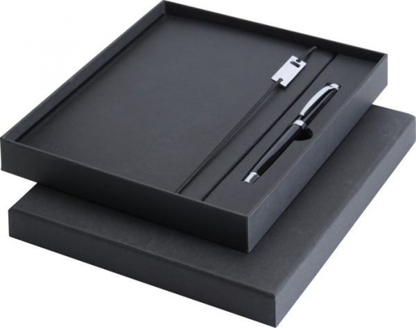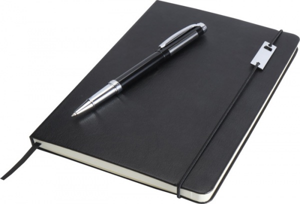 Sada obsauje zápisník A5 a kovový roller (modrá+čierna náplň, dĺžka písania 400 metrov, hrot 0,7 mm). Zápisník má 80 listov linkovaného papiera 80 g/m2, dosky z recyklovaného plastu s imitáciou kože, elastické zatváranie, záložku a rozšíriteľné vrecko.