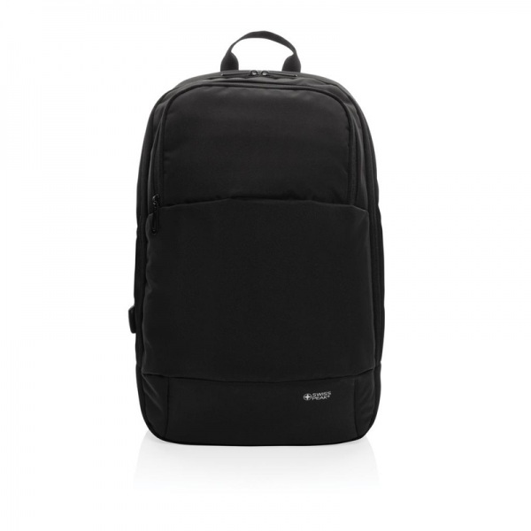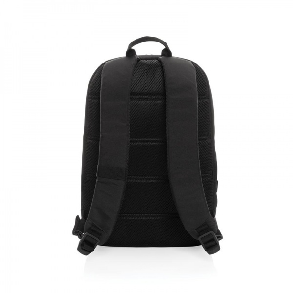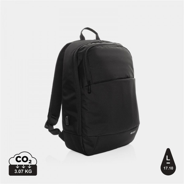 Hlavný priestor na zips, oddiel na 15,6" notebook, predný priestor na zips. Vonkajší USB port. Vyrobené z recyklovaného polyesteru AWARE™. Na výrobu bolo použitých 28,7 500ml PET fliaš a usporených 17,1 lv vody. bez PVC.