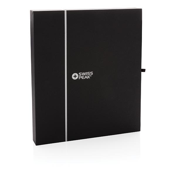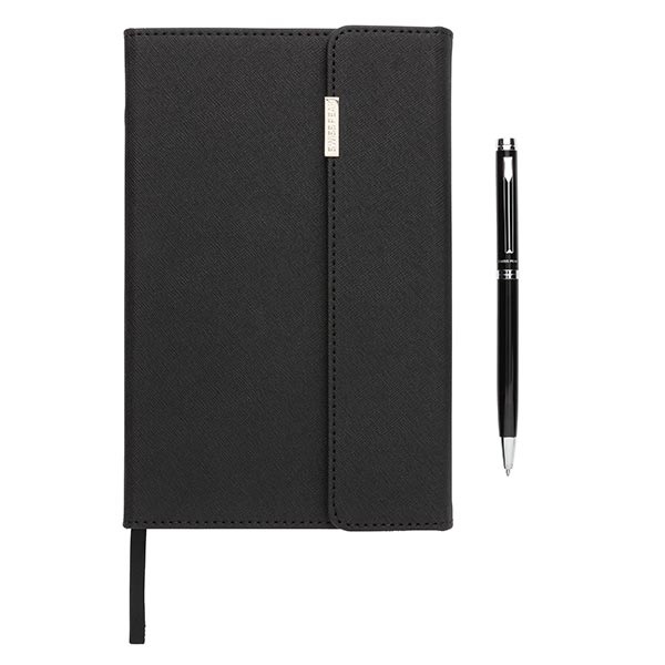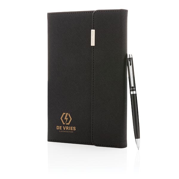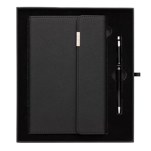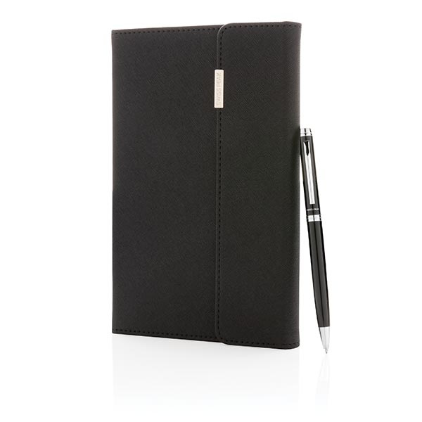 Zápisník A5 s perom v čiernom dizajne. Zápisník so vzorovaným obalom z PU a kovovým logom obsahuje 80 listov 160 strán linkovaného krémového papiera o gramáži 80g/m2. Pero obsahuje nemecký atrament pre písanie až 1 200m textu. Balené v darčekovej krabičke