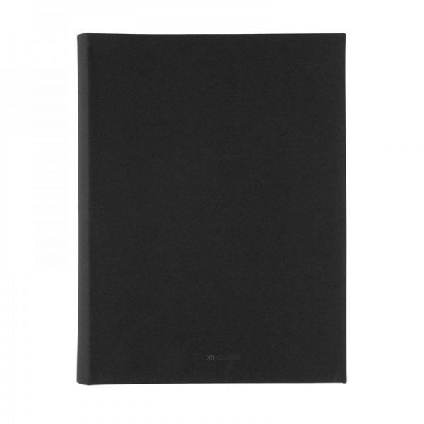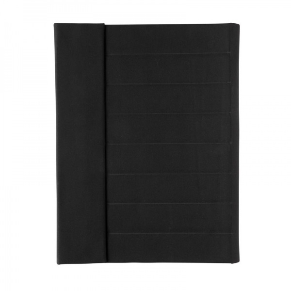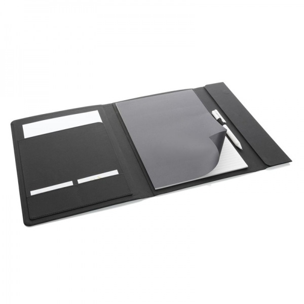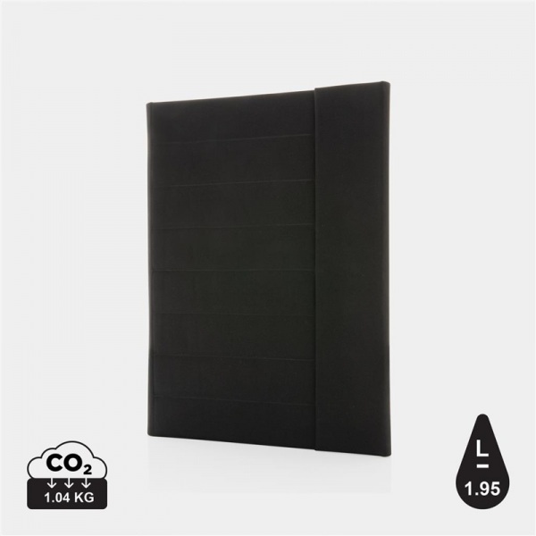Portfólio A4. 1 veľké vrecko, 2 malé vrecká, pútko na pero a vymeniteľný blok z FSC recyklovaného linajkového krémového papiera (20 strán, 70g/m2). Na výrobu bolo použitých 3,2 500ml PET fliaš a ušetrených 1,95 l vody. Bez PVC.