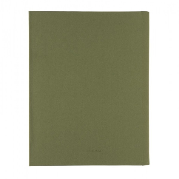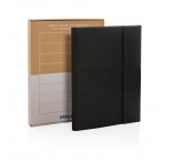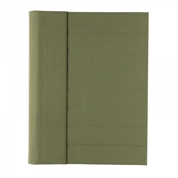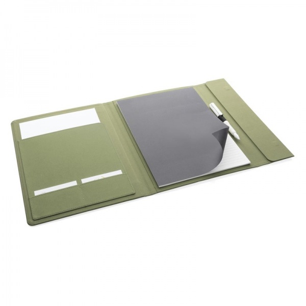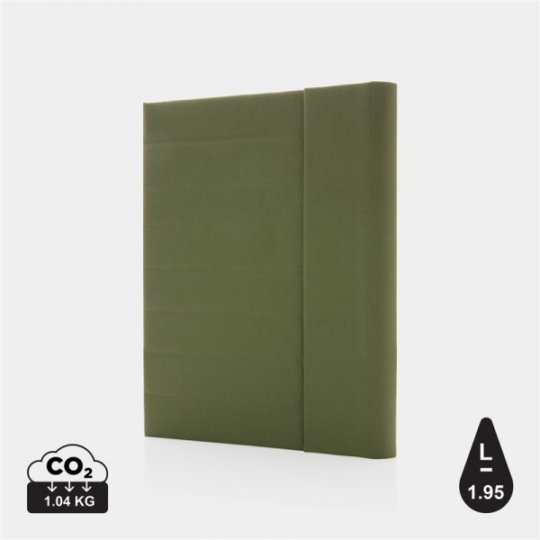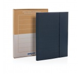 Portfólio A4. 1 veľké vrecko, 2 malé vrecká, pútko na pero a vymeniteľný blok z FSC recyklovaného linajkového krémového papiera (20 strán, 70g/m2). Na výrobu bolo použitých 3,2 500ml PET fliaš a ušetrených 1,95 l vody. Bez PVC.