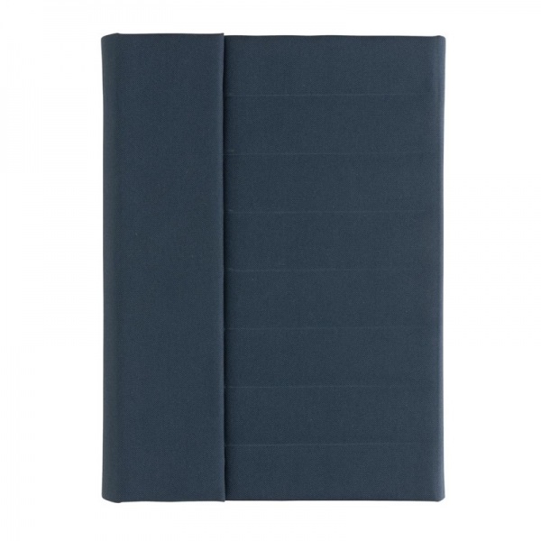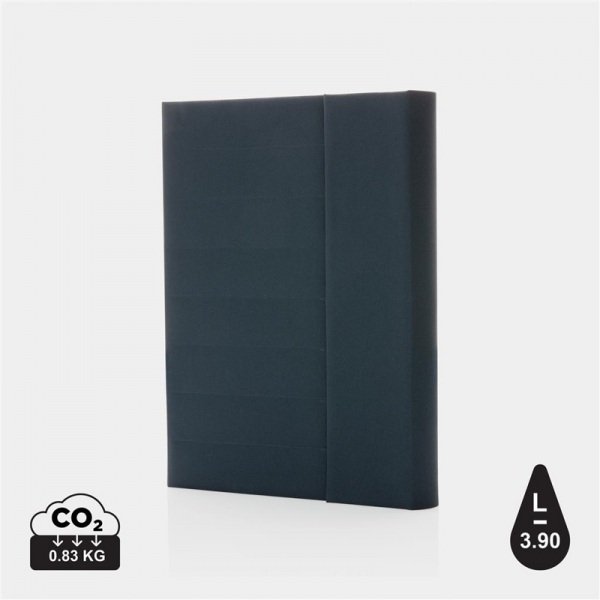 Portfólio A5. 1 veľké vrecko, 2 sloty na vizitky/karty, pútko na pero a vymeniteľný blok z recyklovaného linajkového krémového papiera (64 listov/128 strán, 80g/m2). Na výrobu bolo použitých 6,5 500ml PET fliaš a usporených 3,9 l vody. Bez PVC.