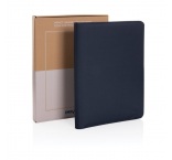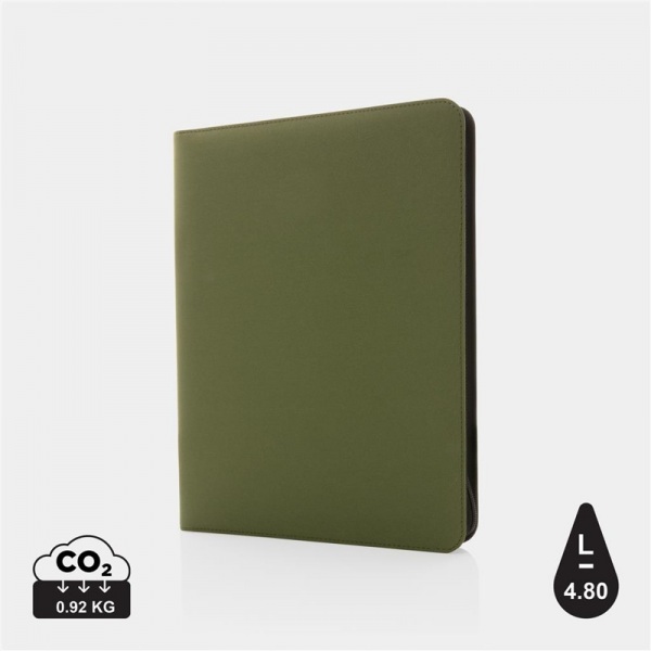 portfólio na zips A4 s obalom z 300D polyesteru. Vrecko na telefón, stojanček, 2 sloty na vizitky/karty a vymeniteľný blok z rec. linajkového papiera (20 strán, 64g/m2). Na výrobu bolo použitých 8 500ml PET fliaš a ušetrených 4,8 l vody. Bez PVC.