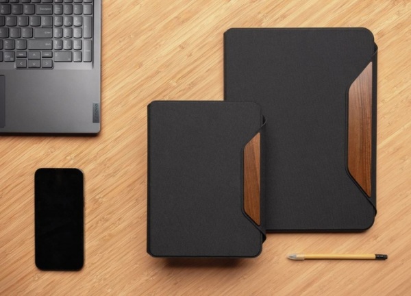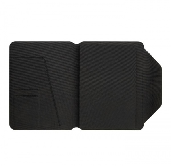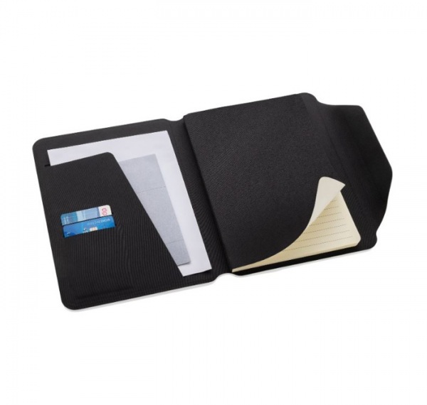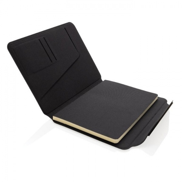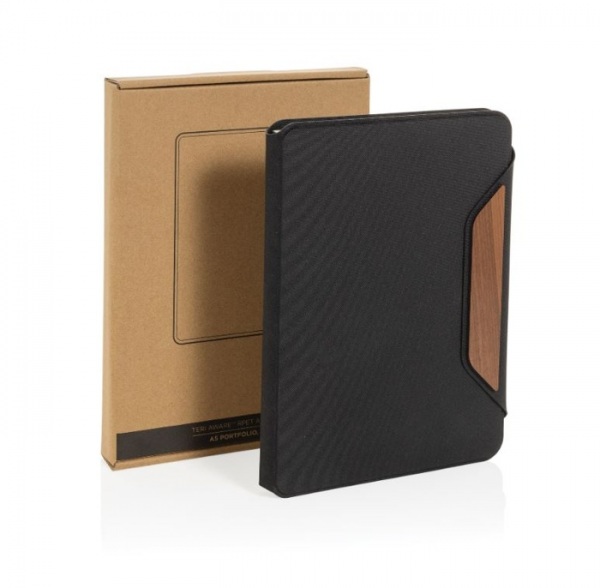 Portfólio so značením AWARE s emblémom z orechového dreva. Magnetické zapínanie, 2 priehradky na vizitky a vrecko na dokumenty. Zápisník A5 zo zmiešaného papiera FSC®, 64 listov (128 strán) linkovaného krémového papiera. Darčekové balenie. Neobsahuje PVC.
