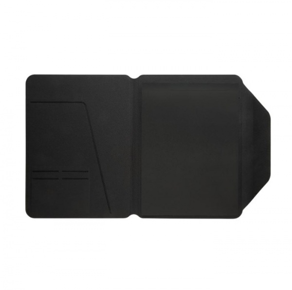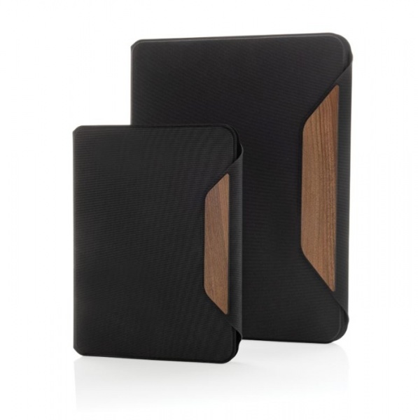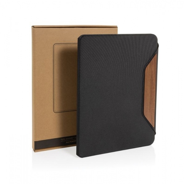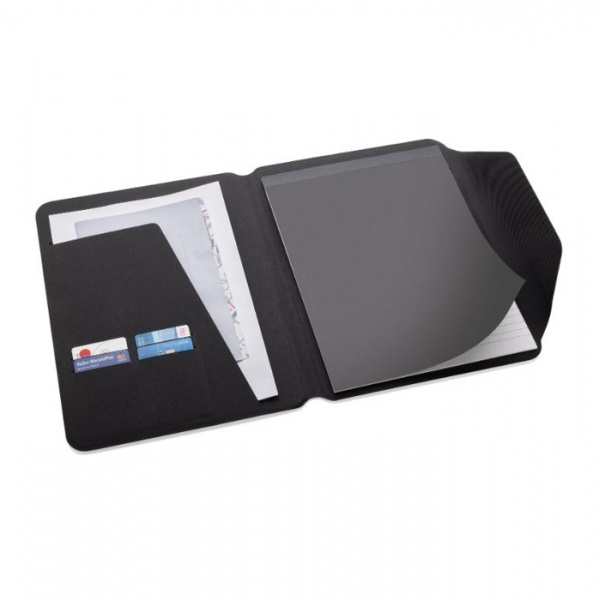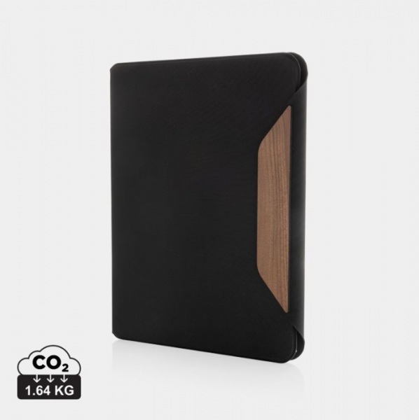 Magnetické zapínanie, 4 priehradky na vizitky a vrecko na dokumenty A4. Priložený poznámkový blok formátu A4, vyrobený zo zmiešaného papiera FSC® poskytuje 30 strán linkovaného papiera krémovej farby (70 g/m2). Darčekové balenie. AWARE™. Neobsahuje PVC.